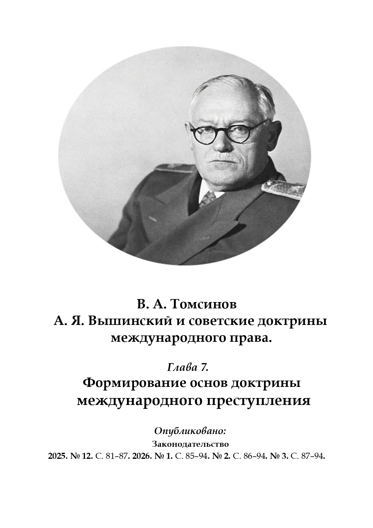 В папке «Проблемы геополитики и международного права», размещена 7 глава сокращенного, журнального варианта книги В.А. Томсинова «А.Я. Вышинский и советские доктрины международного права», опубликованная в журнале «Законодательство» (2025. № 12. 2026. № 1, 2, 3). Она посвящена формированию основ доктрины международного преступления в советской юридической науке и во внешнеполитической деятельности Советского государства.